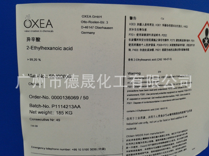 異辛酸為無色微有臭味的液體。 易燃,微溶于冷水,溶于熱水和乙醚,微溶于乙醇。可用作油漆和涂料中間體,醇酸樹脂改性劑,生產(chǎn)過氧化物以作為聚合反應(yīng)(例如PE),以及用于潤滑油酯和PVC穩(wěn)定劑等。