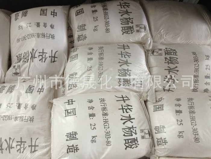 本品為白色塊狀和粉末,允許微黃或淡粉紅色,無臭味微甜后轉(zhuǎn)辛,置空氣中無變化,76℃以上能常壓升華。常壓加熱易脫羧而成苯酚及二氧化碳;其水溶液呈酸性反應(yīng),遇FeCl3呈紫色。本品在水中微溶、在沸水中溶解、在乙醇或乙醚中易溶,在氯仿中略溶。